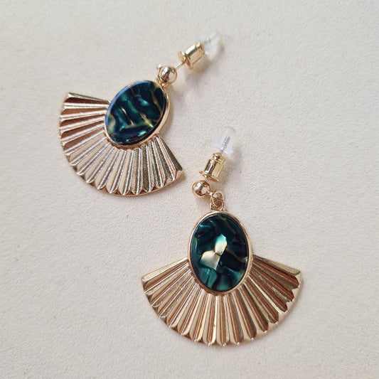 Gold Plated Art Deco Large Statement Fan Green Mother Pearl Shell Drop Earrings for Party and Evening Wear