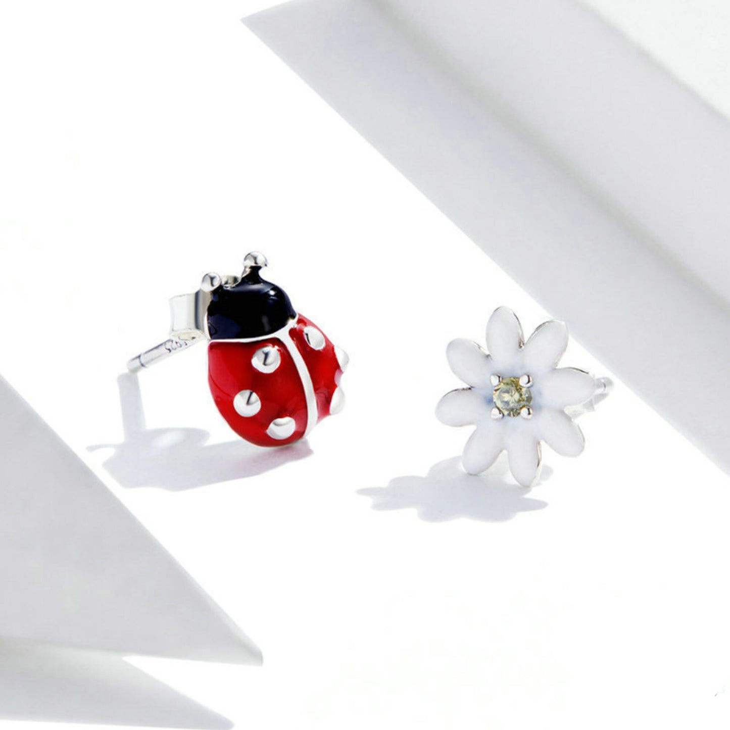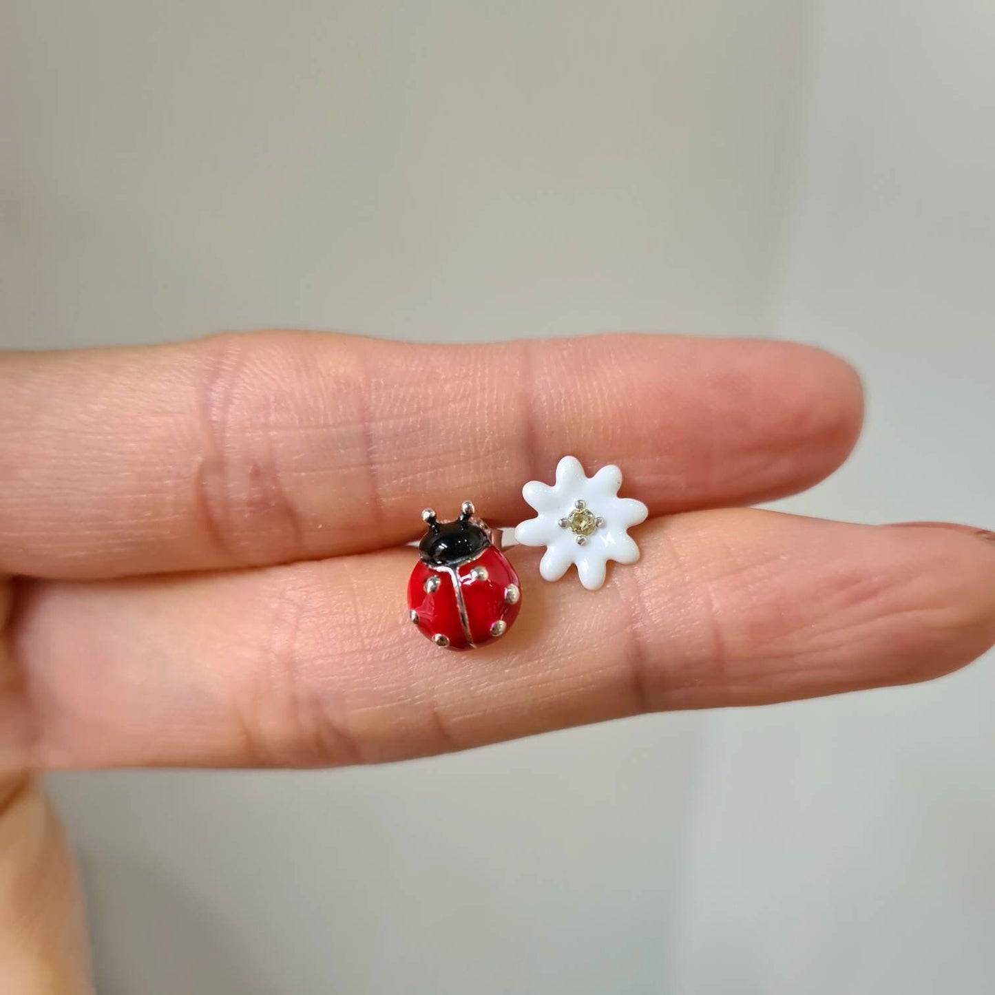 Add a touch of playful charm to your accessory collection with these whimsical mismatched earrings. One earring features a bright red ladybird, while the other showcases a delicate white flower, set against a contrasting backdrop for an elegant, yet fun vibe. Crafted with attention to detail, each earring is lightweight and comfortable to wear, making them perfect for adding a unique twist to any outfit. Whether you're dressing up for a casual day out or adding flair to your evening look, these earrings are sure to turn heads and spark conversation.