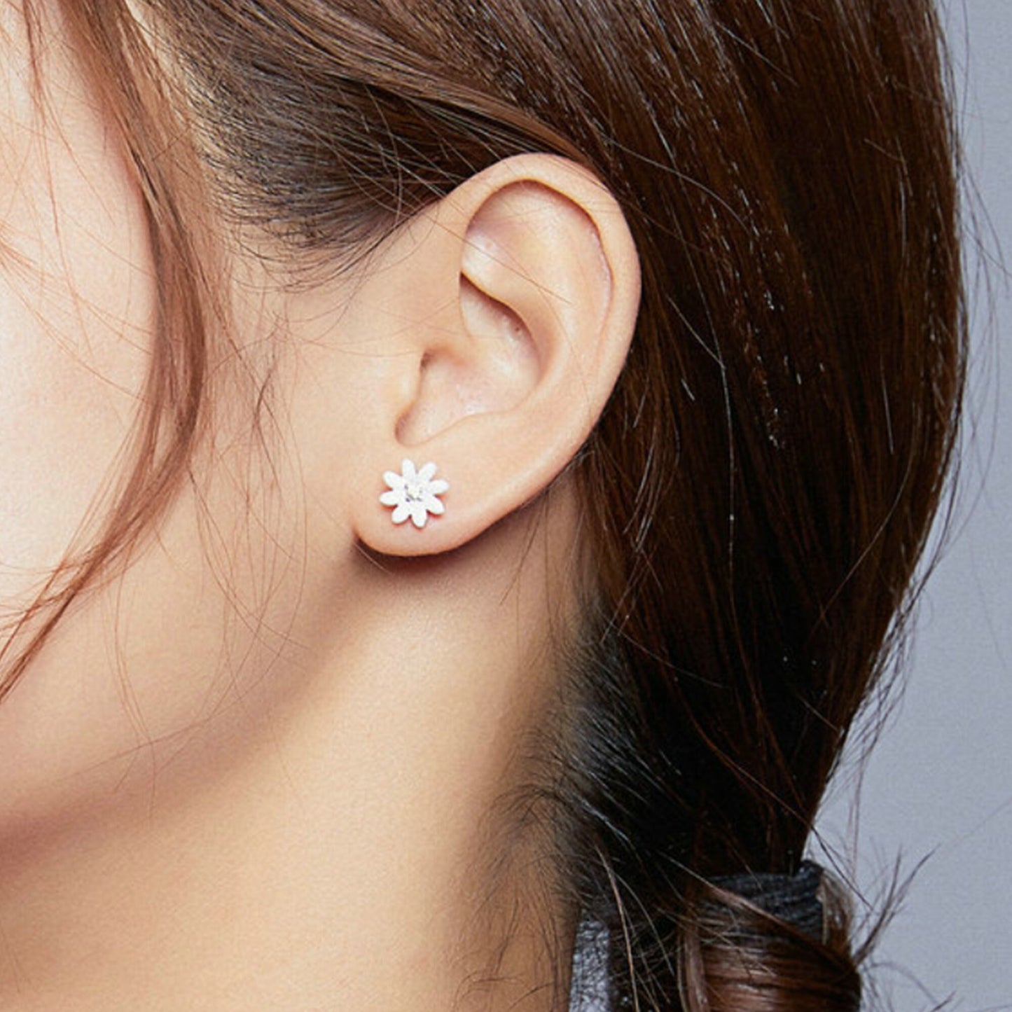 925 Sterling Silver, Red Ladybird & White Flower Stud Earrings